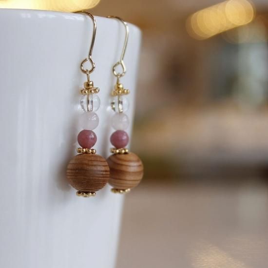 樹齢1000年を超える屋久杉玉と、10月の誕生石を含む天然石を使用したピアスです。